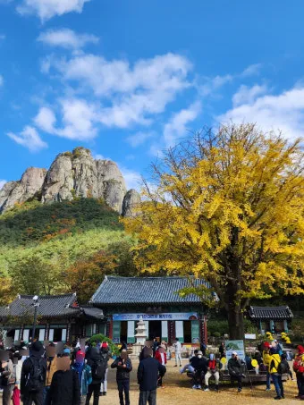 대전사 주변은 10월 25일 전후 3일이 피크입니다. 절 마당에서 바라보는 주왕산 봉우리들이 온통 빨갛고 노란색으로 물드는데, 이건 말로 표현이 안 돼요. 직접 봐야 압니다.